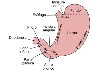 O estômago, nos humanos, é um órgão digestivo em forma de bolsa, situado entre o esôfago e o duodeno. Encontra-se situado por debaixo do diafragma, no lado esquerdo do abdómen. Apresenta duas comunicações: uma superior chamada cárdia, que o comunica ao esôfago e outra inferior, chamada piloro, que o comunica ao intestino delgado. O estômago tem duas classificações, uma cirúrgica e uma anatômica, em sua classificação cirúrgica ele é subdividido em cárdia, fundo, corpo, antro, piloro, curvatura menor, curvatura maior, face anterior e face posterior. O estômago em sua classificação anatômica é dividido em uma porção vertical chamada trituradora, e uma porção horizontal chamada evacuadora.