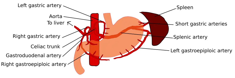 Suprimento sanguíneo do estômago (em inglês): artéria gástrica esquerda e direita, artéria gastro-omental esquerda e artéria gastro-omental direita e artérias gástricas curtas.