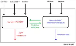 Diagrama simplificado da regulação do apetite no núcleo arqueado do hipotálamo, mostrando a interação recíproca entre os neurônios NPY/AGRP (orexígenos) e POMC (anorexígenos) influenciada por hormônios como a Grelina, a Insulina e a Leptina.