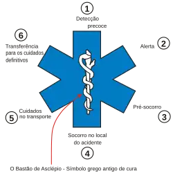 Os seis ramos da estrela representam as seis principais tarefas executadas pelos socorristas, todas através da cadeia de emergência:[14]