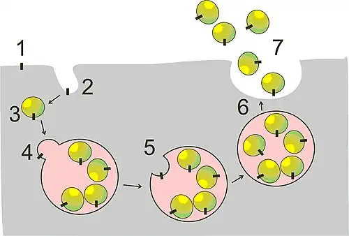 - ↑ Gruenberg, J; Van Der Goot, FG (2006). «Mechanisms of pathogen entry through the endosomal compartments». Nature reviews. 7 (7): 495–504. PMID 16773132. doi:10.1038/nrm1959