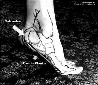 | Demonstração da fáscia plantar. Local onde ocorre a Fasceíte plantar. | |