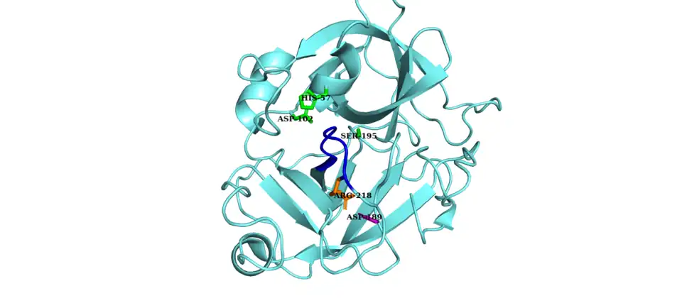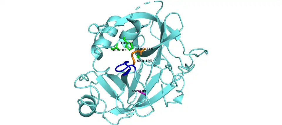 A tríade catalítica do Fator D é composta por Asp102, His57 e Ser195. Outros componentes principais do Fator D são uma ponte de sal Asp189 -Arg218 que estabiliza uma alça auto-inibitória (resíduos de aminoácidos 212 a 218) e a cadeia lateral His 57 na conformação não canônica.[8][9] Em sua forma inibida, a alça auto-inibitória impede o acesso do Fator B ao Fator D. Quando a conformação auto-inibida do Fator D é abordada pelo complexo C3bB, C3bB desloca a ponte salina no Fator D e resulta em uma nova ponte salina entre o Arg 234 do Fator B e Asp 189 do Fator D.[10][11] O deslocamento da ponte de sal do Fator D resulta em um realinhamento da alça auto-inibitória e uma rotação da cadeia lateral de histidina do local ativo, criando a forma canônica do Fator D. A clivagem da ligação cindível no Fator B então segue, liberando o fragmento Ba e formando C3bBb, a via alternativa C3-convertase .[12]