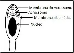 O acrossomo é uma grande vesícula secretória que sobrepõe o núcleo na região apical da cabeça do espermatozoide (figura 2). Morfologicamente, a reação acrossômica é vista como múltiplas fusões entre a membrana do acrossomo e a membrana plasmática do gameta, formação de membranas híbridas e expulsão do conteúdo acrossomal. Atualmente é aceito que ZP3 é o agonista natural que inicia a reação acrossômica quando um espermatozoide intacto se liga à ZP. O estímulo da ZP3 leva a uma despolarização da membrana do espermatozoide, o que ativa canais de Ca2+ voltagem dependentes. Esse aumento intracelular de Ca2+ leva à reação acrossômica.