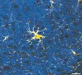 A foto acima mostra uma multidão de fibras nervosas do córtex cerebral corada em azul e, bem no meio, uma célula glial, corada em amarelo.