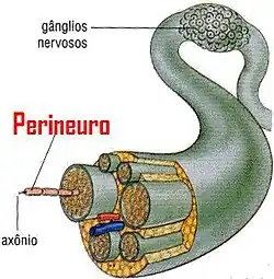 As fibras nervosas, formadas pelos prolongamentos dos neurônios (dendritos ou axônios) e seus envoltórios, organizam-se em feixes. Cada feixe forma um nervo. Cada fibra nervosa é envolvida por uma camada conjuntiva denominada endoneuro. Cada feixe é envolvido por uma bainha conjuntiva denominada perineuro. Vários feixes agrupados paralelamente formam um nervo. O nervo também é envolvido por uma bainha de tecido conjuntivo chamada epineuro. Em nosso corpo existe um número muito grande de nervos. Seu conjunto forma a rede nervosa.