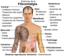 A fibromialgia (abreviado para FM) é uma síndrome em que o cérebro cria as dores e sintomas, por um mecanismo ainda não bem determinado mas que está relacionado aos sítios que também promovem a depressão e ansiedade, e, por essa razão, as associações com essas patologias é frequente. Seus sintomas constituem uma síndrome dolorosa reumática onde existem uma diversidade de gatilhos (multifatorial) que promovem aumento da tensão muscular, dores musculares e nos tecidos fibrosos (tendões e ligamentos), de tipo crônico-difuso, flutuante e migratório - associada ou não a rigidez, astenia (perda de força com fatigabilidade), parestesias, sensação de edema , insônia ou distúrbio do sono, alterações da sensibilidade (tais como sensibilidade aumentada a estímulos)[5]. Alguns autores associam esses problemas a um distúrbio no sistema dopaminérgico, no sistema serotoninérgico,[6] no funcionamento das mitocôndrias e/ou no sistema endócrino.[7]