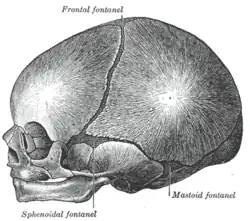 Crânio ao nascimento, mostrando a fontanela lateral.