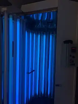 Existem nas clínicas dermatológicas a cabine com várias lâmpadas de ultravioleta para o corpo todo ou painel e equipamentos que emitem radiação localizada para pequenas áreas, sempre sob supervisão médica. A fototerapia é diferente do bronzeamento artificial- proibido no Brasil- que além de não ser terapêutico, pode levar ao envelhecimento precoce e aumento do risco para câncer de pele.