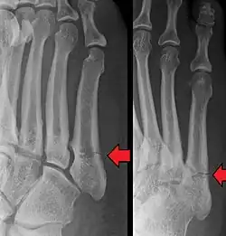 - ↑ Bica, D; Sprouse, RA; Armen, J (1 de fevereiro de 2016). «Diagnosis and Management of Common Foot Fractures.». American Family Physician. 93 (3): 183–91. PMID 26926612