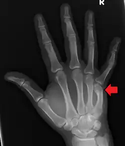 - 1 2 Soong, M; Got, C; Katarincic, J (agosto de 2010). «Ring and little finger metacarpal fractures: mechanisms, locations, and radiographic parameters.». The Journal of Hand Surgery. 35 (8): 1256–9. PMID 20684925. doi:10.1016/j.jhsa.2010.05.013