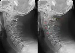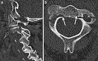 - ↑ Pratt, H.; Davies, E.; King, L. (2008). «Traumatic injuries of the c1/c2 complex: computed tomographic imaging appearances.». Curr Probl Diagn Radiol. 37 (1): 26–38. PMID 18054664. doi:10.1067/j.cpradiol.2007.07.001
