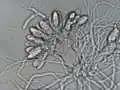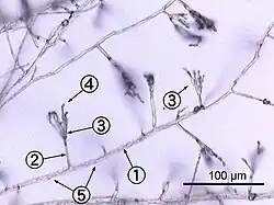 - As células da maioria dos fungos crescem como estruturas tubulares, alongadas e filamentosas designadas hifas. Estas podem conter múltiplos núcleos e crescer a partir das suas extremidades. Cada extremidade contém um conjunto de vesículas - estruturas celulares compostas por proteínas, lípidos e outras moléculas orgânicas - chamado Spitzenkörper.[21] Tanto fungos como Oomycetes crescem como células hifais filamentosas.[22] Em contraste, organismos de aspecto semelhante, como as algas verdes filamentosas, crescem por divisão celular repetida ao longo de uma cadeia de células.[14]