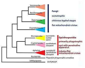 A análise filogenética demonstrou que os Microsporidia, parasitas unicelulares de animais e protistas, são fungos endobióticos altamente derivados (vivem nos tecidos de outra espécie) e bastante recentes.[96][123] Um estudo de 2006 conclui que os Microsporidia constituem um grupo irmão dos fungos verdadeiros, isto é, cada um deles é o parente evolutivo mais próximo do outro.[124] Hibbett e colegas sugerem que esta análise não colide com a sua classificação de Fungi, e embora Microsporidia tenha sido elevado ao estatuto de filo, reconhece-se que é necessária análise suplementar para clarificar as relações evolutivas no seio deste grupo.[42]