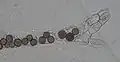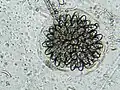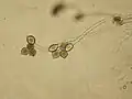Nos Glomeromycetes (antes Zygomycetes), as hifas haploides de dois indivíduos fundem-se, formando um gametângio, uma estrutura celular especializada que se torna uma célula produtora de gâmetas férteis. O gametângio evolui para um zigósporo, um esporo com parede espessa formado pela união de gâmetas. Quando o zigósporo germina, sofre meiose, gerando novas hifas haploides, as quais podem então formar esporangiósporos assexuados. Estes esporangiósporos permitem ao fungo dispersar-se rapidamente e germinar como micélios haploides geneticamente idênticos.[81]