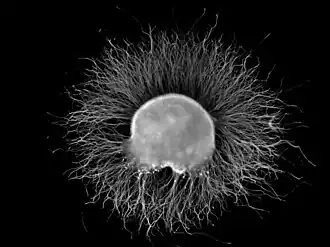 ![]() Um gânglio da raiz dorsal de um embrião de galinha (por volta do estágio do dia 7) após incubação durante a noite em meio de crescimento com NGF, corado com anticorpo anti-neurofilamento. | |