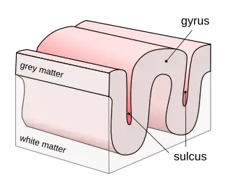 ![]() Representação de um giro (gyrus) cercado por dois sulcos (sulcus) | |