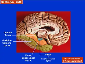 Cérebro humano visto de baixo. Giro para-hipocampal mostrado em azul.