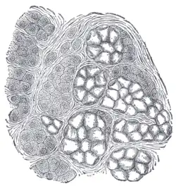 Os lobos contêm lóbulos menores, que por sua vez contêm adenômeros, as unidades secretoras da glândula. Cada adenômero contém um ou mais alvéolos, que são pequenos agrupamentos de células que secretam os seus produtos em um duto. Os alvéolos de cada adenômero são compostos de células serosas ou mucosas, com predomínio das primeiras. Alguns adenômeros mucosos podem também ser cobertos com uma meia-lua serosa, uma camada de células serosas secretoras de lisozima com a aparência de meia-lua.