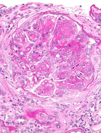 O achado de microscopia óptica mais característico é a hipercelularidade e duplicação da membrana basal glomerular. Em todos os casos existe deposição do sistema complemento nos glomérulos e depósito de imunoglobulinas ocorre menos freqüentemente.