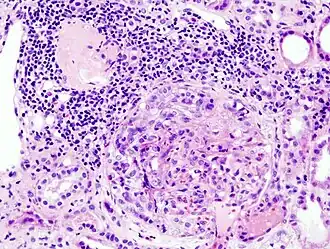 - Tipo II: Causada pela deposição de complexos imunes (complexo anticorpo-antígeno) representa 25% dos casos. Pode ser associado a Lúpus eritematoso sistémico (LES), glomerulonefrite pós-estreptocócica, púrpura de Henoch-Schönlein e nefropatia por IgA.