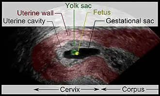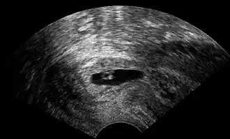 | Ultrassonografia vaginal de uma gravidez cervical com idade gestacional de cinco semanas.[1] | |