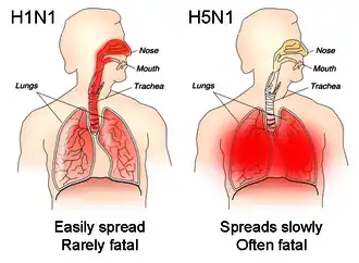 A proteína viral hemaglutinina é responsável por determinar não só que espécies é que determinada estirpe pode infetar, mas também em que local do trato respiratório é que essa estirpe se irá alojar.[77] As estirpes que são facilmente transmitidas entre pessoas possuem proteínas de hemaglutinina que se ligam a receptores na parte superior do trato respiratório, como os do nariz, garganta e boca. Por outro lado, a estirpe potencialmente mortal de H5N1 liga-se a recetores profundos dos pulmões.[78] Esta diferença no local de infeção pode explicar porque é que o H5N1 causa pneumonia viral grave nos pulmões, ao mesmo tempo que não é facilmente transmitida pela tosse ou por espirros.[79][80]