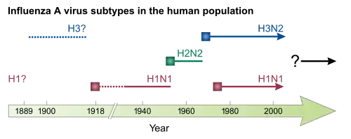 - ↑ Potter, CW (2001). «A history of influenza». Journal of applied microbiology. 91 (4): 572–579. PMID 11576290. doi:10.1046/j.1365-2672.2001.01492.x