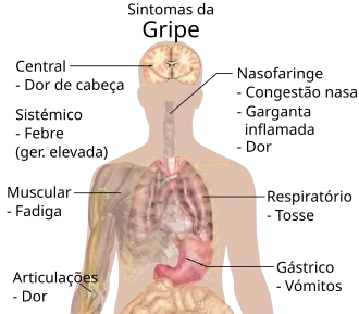 Influenza, comumente conhecida como Gripe, é uma doença infecciosa causada por diversos vírus ARN da família Orthomyxoviridae e que afeta aves e mamíferos. Os sintomas mais comuns são calafrios, febre, rinorreia, dores de garganta, dores musculares, dores de cabeça, tosse, fadiga e sensação geral de desconforto. Em crianças pode ainda provocar diarreia e dores abdominais. Embora seja frequentemente confundida com a constipação, a gripe é uma doença mais grave provocada por um tipo de vírus diferente.[8]