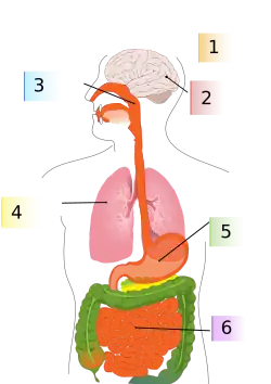 Diagrama dos sintomas da gripe A (H1N1) no ser humano. 1- Corpo em geral - febre 2- Psicológico - letargia, falta de apetite 3- Nasofaringe - rinorreia, dor de garganta 4- Sistema Respiratório - tosse 5- Gástrico - náuseas, vómitos 6- Intestino - diarreia.[5]