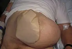 Paciente com colostomia complicada por uma grande hérnia parastomal.