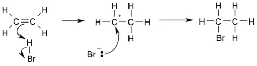 Na hidrohalogenação, um alceno reage com um halogeneto de hidrogênio seco (HX) como cloreto de hidrogênio (HCl) ou brometo de hidrogênio (HBr) para formar um mono-haloalcano. A regra de Markovnikov estabeleceu que o halogênio se liga ao carbono mais substituído. Se a reação for realizada em água, normalmente resulta em uma halohidrina, que contém o halogênio e um -OH em carbonos vicinais e por isso a reação é realizada em um solvente inerte, como CCl4 ou em fase gasosa. A reação dos alcinos é semelhante, sendo o produto um di-halogeneto geminal; mais uma vez, a regra de Markovnikov é seguida.