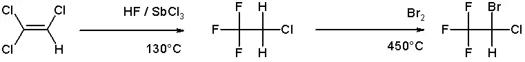 Um dos métodos de preparação do halotano consiste na reação de adição de ácido fluorídrico ao tricloroetileno em presença de tricloreto de antimônio seguida de uma reação de substituição com bromo: