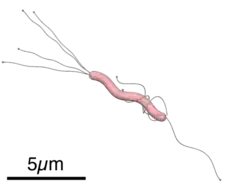 Com seus flagelos e forma espiral, a bactéria penetra no muco gástrico e pode ser encontrada no muco gástrico ou na superfície do células epiteliais.