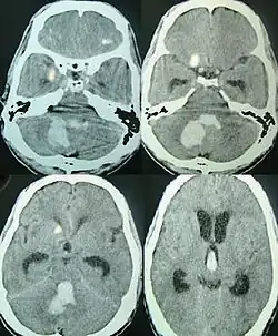 A hemorragia intraparenquimatosa pode ser reconhecida na tomografia computadorizada porque o sangue aparece mais brilhante do que outro tecido e é separado da mesa interna do crânio por tecido cerebral. O tecido que envolve um sangramento é muitas vezes menos denso do que o resto do cérebro por causa do edema e, portanto, aparece mais escuro na tomografia computadorizada.[14]