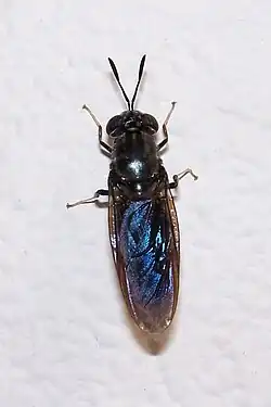 - ↑ Oliveira, Fernanda. «Assessment of Diptera: Stratiomyidae, genus Hermetia illucens (L., 1758) using electron microscopy». AkiNik Publications. Journal of Entomology and Zoology Studies: 147-152. Consultado em 19 Agosto 2021 «A Mosca soldado-negro (Hermetia illucens), é um Díptero pertencente à família Stratiomyidae (mais de 2000 espécies e 400 géneros)»