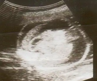 | Uma ultrassonografia mostrando um feto com hidropisia fetal. | |