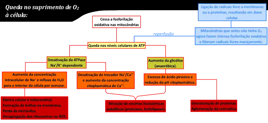 Uma célula que tenha sofrido lesão reversível causada pela hipóxia pode ser levada à morte caso a oferta de O2 seja restabelecida de súbito. Esse fenômeno é chamado de lesão por reperfusão e é atribuído a realização da fosforilação oxidativa por mitocôndrias semi-danificadas por hipóxia, o que leva a intensa liberação de radicais livres (principalmente ânions superóxidos). Além disso é possível que a hipóxia prejudique as vias de destoxificação de radicais livres como os antioxidantes (vitaminas A, C e E; e glutationa citosólico) e as enzimas catalases, superóxido dismutase e glutationa peroxidase. Exitem quatro tipos de hipoxia: hipoxia hipoxia, Hipoxia Estagnante, Hipoxia anemica, Hipoxia Hitóxica.