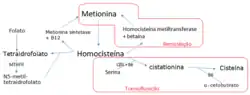 A homocisteína faz parte do grupo dos aminoácidos sulfurados, e sua formação no organismo se dá pela desmetilação da metionina, que por sua vez pode ser adquirida através da dieta ou do catabolismo da própria homocisteína.[8] A metionina é catabolizada no fígado, em S-adenosilmetionina, S-adenosil-homocisteína e homocisteína.[9] O metabolismo da homocisteína é regulado por três fatores: a quantidade de S-adenosilmetionina, de folatos e por meio do estado de oxidorredução.[10] S-adenosilmetionina: Quando há grande oferta de proteínas de origem animal, cerca de 70% da homocisteína é catabolizada pela enzima cistationina beta sintase (CβS), juntamente com a participação da vitamina B6, através da via da transulfuração. Já no jejum ou quando há menor concentração dessas proteínas, apenas 10% da homocisteína segue essa via.[11] O aumento da concentração de metionina favorece o catabolismo da homocisteína pela CβS,[12] entretanto, se houverem altas reservas de folatos, o excesso de metionina causa hiper-homocisteinemia.[13] Folatos: Os folatos, quando em maior quantidade, favorecem o aumento da 5-MTHFR, inibindo a via de transmetilação por via da enzima glicina metiltransferase, o que gera aumento da S-adenosilmetionina. Esse aumento da S-adenosilmetionina resulta na inibição da via de desmetilação pela enzima 5-MTHFR e na ativação da via de transulfuração pelo aumento na atividade da CβS. Esse processo culmina na redução dos níveis de homocisteína.[14] Estado de oxidorredução: Na forma oxidada, a CβS é ativa e a metionina sintetase é inativa.[15] Nesse sentido, em condições oxidativas a via de desmetilação é diminuída, sendo, por fim, favorecida a transulfuração.[16]