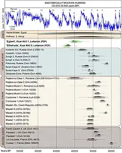Além disso, várias outras evidências de imagens abstratas, estratégias de subsistência ampliadas e outros comportamentos "modernos" foram descobertas na África, especialmente na África do Sul, do Norte e Oriental, anteriores a 50 mil anos atrás (algumas anteriores a 100 mil anos atrás). O sítio da caverna de Blombos, na África do Sul, por exemplo, é famoso pelas placas retangulares de ocre gravadas com desenhos geométricos. Usando várias técnicas de datação, confirmou-se que o local tem cerca de 77 e 100-75 mil anos.[144][145] Recipientes com cascas de ovos de avestruz gravados com desenhos geométricos datados de 60 mil anos atrás foram encontrados em Diepkloof, na África do Sul.[146] No Marrocos, foram encontradas contas e outros ornamentos pessoais que podem ter até 130 mil anos de idade; além disso, a Cave of Hearths (Caverna das Lareiras), na África do Sul, produziu uma série de miçangas que datam de muito antes de 50 mil anos atrás,[147] e foram encontradas miçangas de concha que datam de cerca de 75 mil anos atrás na Blombos Cave (Caverna de Blombos), na África do Sul.[148][149][150]