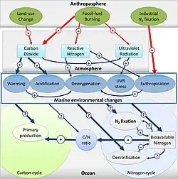 O diagrama à direita mostra alguns impactos humanos sobre o ciclo do nitrogênio marinho. O nitrogênio biodisponível (Nb) é introduzido nos ecossistemas marinhos por escoamento ou deposição atmosférica, causando eutrofização, formação de zonas mortas [en] e expansão das zonas mínimas de oxigênio (OMZs). A liberação de óxidos de nitrogênio (N2O, NO) das atividades antropogênicas e das zonas depletadas de oxigênio causa a redução do ozônio estratosférico, levando a uma maior exposição à radiação UVB, o que causa danos à vida marinha, chuva ácida e aquecimento dos oceanos. O aquecimento dos oceanos causa a estratificação da água, a desoxigenação e a