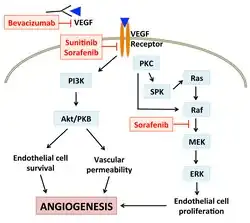 Por meio da ligação ao VEGFR e a outros receptores de VEGF nas células endoteliais, o VEGF pode desencadear várias respostas celulares, como a promoção da sobrevivência celular, a prevenção da apoptose e a remodelação do citoesqueleto, o que promove a angiogênese. O bevacizumabe (nome comercial Avastin) retém o VEGF no sangue, diminuindo a ligação do VEGF aos seus receptores. Isso resulta na redução da ativação da via de angiogênese, inibindo assim a formação de novos vasos sanguíneos nos tumores.[14]