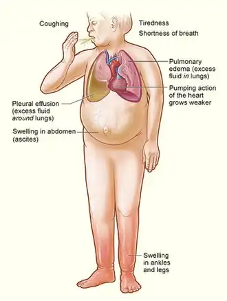 Insuficiência cardíaca (IC), muitas vezes descrita como insuficiência cardíaca congestiva (ICC), é uma condição em que o coração é incapaz de bombear sangue na corrente sanguínea em quantidade suficiente para dar resposta às necessidades do corpo, ou para fazê-lo, recorrer à pressão de enchimento elevada [11][12][13] Os sinais e sintomas mais comuns incluem falta de ar, fadiga e pernas inchadas.[4] A falta de ar geralmente agrava-se com o exercício físico ou em posição deitada, e é capaz de acordar a pessoa durante a noite.[4] Existe também uma redução da capacidade para a realização de exercício físico.[14] A dor torácica, incluindo angina, geralmente não é um sintoma de insuficiência cardíaca.[15]