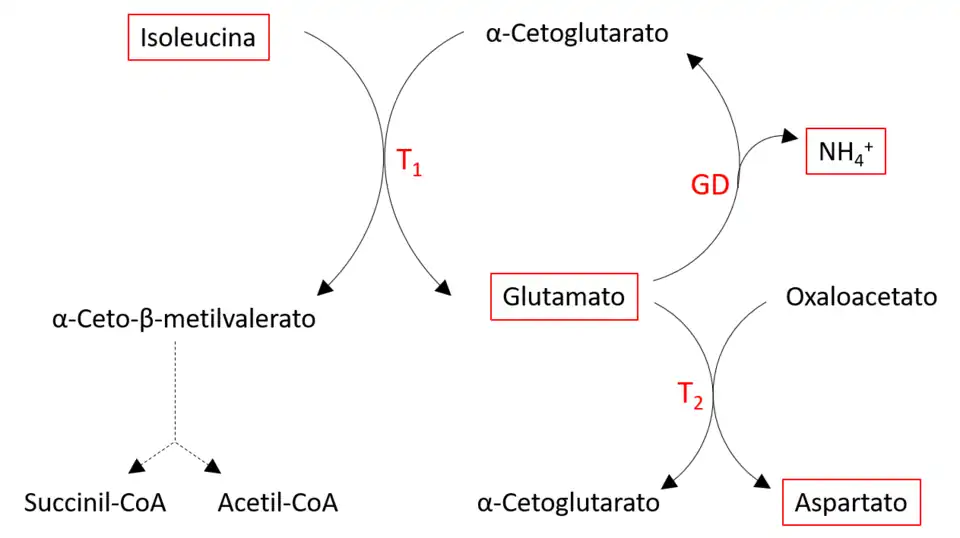 A transaminase de aminoácidos ramificados catalisa a transaminação dos BCAAs (valina, leucina e isoleucina). No caso da isoleucina, o α-cetoácido resultante dessa reação é o α-ceto-β-metilvalerato, que depois de outras cinco reações é convertido a succinil-CoA ou acetil-CoA, intermediários do ciclo de Krebs (ou ciclo do ácido cítrico), utilizados para a produção de ATP. O grupo amino removido do aminoácido é transferido então para o α-cetoglutarato, formando glutamato. O glutamato pode seguir duas vias e degradação, comuns à maioria dos aminoácidos: uma nova transaminação ou uma desaminação. A transaminação do glutamato é feita com o oxaloacetato, retornando a α-cetoglutarato e gerando aspartato (pela transferência do grupo amino para o oxaloacetato através da enzima aspartato transaminase ou transaminase glutâmico-oxaloacética). O glutamato também pode ser desaminado pela enzima mitocondrial glutamato desidrogenase, encontrada principalmente no fígado gerando NH3 (amônia), convertida a NH4+ (íon amônico) no pH fisiológico. Esta enzima é específica para o glutamato, e não se tem conhecimento de nenhuma enzima com ações similares para outros aminoácidos. Portanto, para que o grupo amino dos aminoácidos seja eliminado em forma de amônia é imprescindível que passem pelo glutamato. O aspartato e o íon amônico gerados pela degradação do glutamato entram então no ciclo da ureia. Essa conversão de NH4+ em ureia é fundamental para manter as concentrações deste íon baixas no organismo, uma vez que é extremamente tóxico [10].