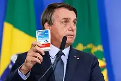 Os medicamentos, como a cloroquina, foram amplamente distribuídos e apoiados pelo governo federal.[29] O Exército Brasileiro, sob a orientação do Ministério da Saúde, produziu mais de 3,2 milhões de comprimidos de cloroquina em 2020[166] e distribuiu 2,9 milhões desses comprimidos para estados, municípios e hospitais militares.[167] Essa distribuição representou um aumento significativo em relação aos anos anteriores, chegando a ser 11 vezes maior.[168] Em fevereiro de 2021, o ministro do Tribunal de Contas da União (TCU), Benjamin Zymler, autorizou um ofício que exigia explicações sobre a distribuição de cloroquina por parte desses órgãos federais.[169][170][171]