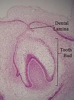 A lâmina dentária é uma banda de tecido epitelial visto em secções histológicas no desenvolvimento de um dente.[1][2] A lâmina dental é primeira evidência de dente e começa a se desenvolver na sexta semana no útero ou três semanas após a ruptura da membrana bucofaringeal. É formado nas células do ectoderma oral e se proliferam mais rapidamente do que células de outras áreas. Eventualmente, a lâmina dentária desintegra-se em pequenos aglomerados de epitélio e é reabsorvido. Nas situações em que os não são reabsorvidos, cistos são formadas ao longo do desenvolvimento dente e retardam a sua erupção na cavidade bucal.
