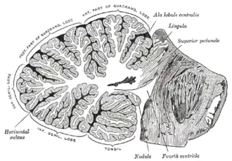 ![]() Seção sagital do cerebelo, próxima à junção do vermis com o hemisfério cerebelar. A língula está situada no canto superior direito. | |