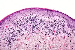 Histologicamente, observa-se superfície epitelial ortoqueratinizada ou paraqueretinizada, degeneração ou liquefação da camada basal do epitélio, papilas epiteliais em forma de serrilhado, infiltrado linfocitário e macrofágico em banda subepitelial.