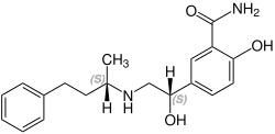 Labetalol contém dois centros estereogênicos e consiste em quatro estereoisómeros. Esta é uma mistura de ( R , R ) -, ( S , R ) -, ( R , S ) - e o ( S , S ) - formulário: