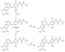 O lenvatinib é metabolizado pela enzima hepática CYP3A4 em desmetil-lenvatinib (M2). M2 e o próprio lenvatinibe são oxidados pela aldeído oxidase (AO) a substâncias chamadas M2 'e M3',[5] os principais metabólitos nas fezes. Outro metabólito, também mediado por uma enzima CYP, é o N- óxido M3. A metabolização não enzimática também ocorre, resultando em um baixo potencial de interações com inibidores e indutores de enzimas.[2]